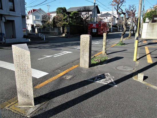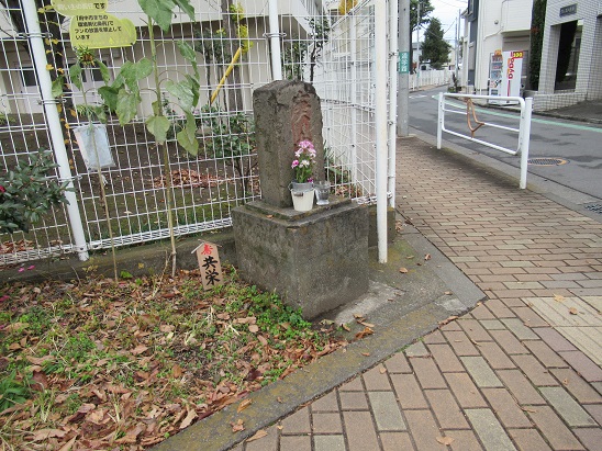 寄り道して、白糸台駅の西にある府中第四小学校の南東角にいく。 正面に 大きく「庚申塔」と刻まれた石塔が建っている。 左側に「 東 品川道 西 府中道 上車返阪村」 とある。 右側には、嘉永6年(1853)とあるが、昭和3年 改造 と刻まれているので、新たに造りなおしたものだろう。 すぐ先に品川道の石柱もある。 ![]() 街道に戻ると、染屋不動尊がある。 |