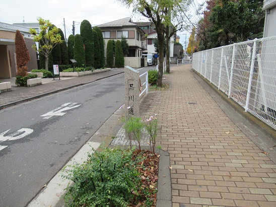 元の街道に戻り、日野橋交差点から、奥多摩街道に入る。 200mほど進んで、三叉路を左に入る。 柴崎市民体育館の脇を通り多摩川まで進むことになる。 <歴史と文化の散歩道 案内板 |