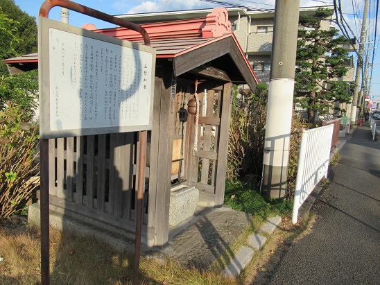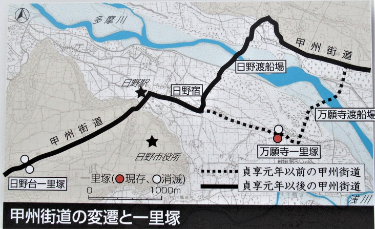一里塚の南塚のみが、昔からの状態で残されている。当初の甲州街道の一里塚で、先ほど青柳稲荷神社の先で訪れた貝殻阪から多摩川に下りて万願寺渡船場を経由してくるものであった。 甲州街道の変遷(クリックと拡大)や、塚の断面図断面図などが、説明板で詳しく紹介されている。 |