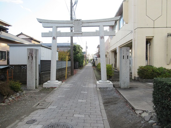 500mほど先の青柳福祉センター前に、常夜燈が建つ。完成1年(1799)の建立である。脇の鳥居から南に、青柳稲荷神社に続長い参道がある。 ここからは街道を進む代わりに、神社経由で多摩川の川沿いの道を西にすすんでから、街道に合流することにした。 |