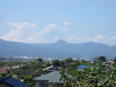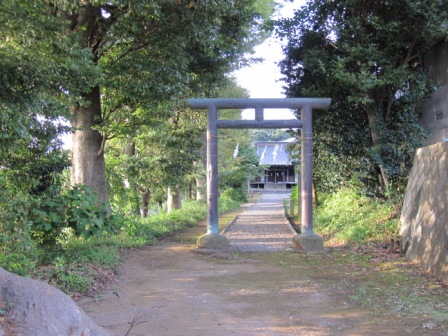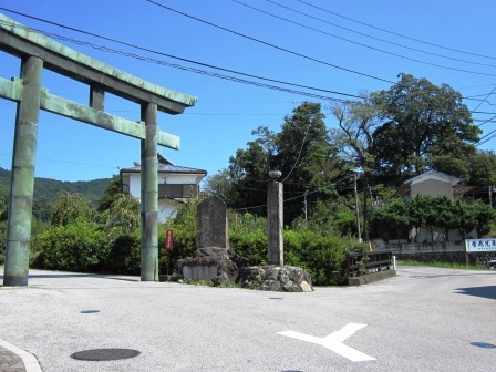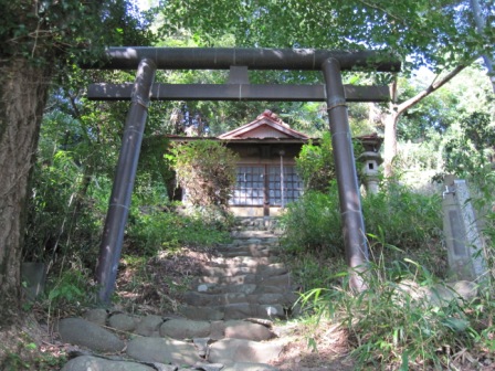 | 宗我神社の前から西に向かって坂を下る。細い沢を越えて、右に入る山道を登って行く。富士山方面への眺めは素晴らしい。 ミカン山の中の左側に石塔が数基立っている。その角を曲がっていくと、三叉路の角に鳥居が見えてくる。 |