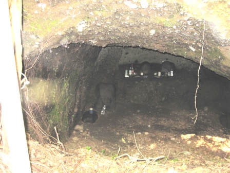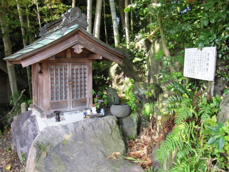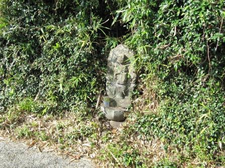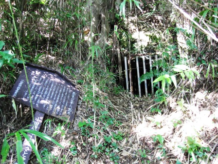 | 公民館から先に進むと信号があり、細い道を右に入る。最初の角を左に曲がるとすぐ細い山道となる。途中に石段がありその先に鳥居と三島神社がある。 石段を登り始めた左側に標柱があるが倒れており、また、草木が密集していて風外窟の場所は、見つけにくい。 石段を数段上ったところから左に入り、15mほど小さい木を掻き分けながらすすむと、漸く、小さい横穴が見つかった。 |