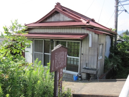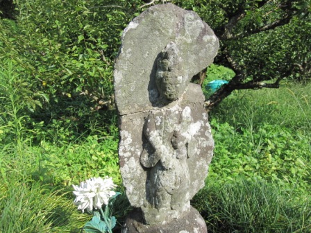| すぐ下の道を左へ山道を下ると、左側に曽我岸の公民館があり、地蔵の立つ祠と説明版が立つ。 |