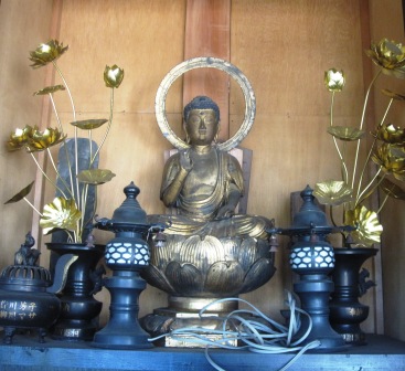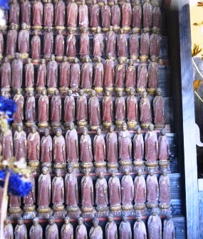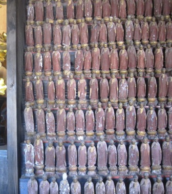 中央に祀られている本尊の阿弥陀如来座像は江戸時代の造立という。その左右に多数の如来型立像がびっしりと並らぶ。この千体仏は室町から江戸時代にかけての製作と認められる、という。 左側の石碑には表に「鬼鹿毛馬頭観世音」と、馬の頭が、裏には昭和十二年四月と刻まれている。静岡県駿東郡小山町新柴の円通寺の馬頭観音を表しているという。 |