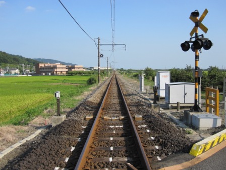 | バス道路に出て右に行くと上大井駅であるが、左手に進み、曽我大沢公民館の所から、南に向かい、御殿場線の踏切を越える。国府津駅の直前まではまっすぐの線路である。 曽我小学校 |