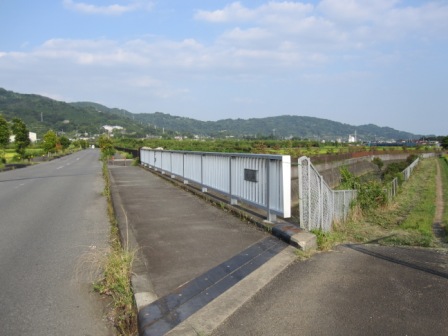 | 間もなく関口橋で東側からまっすぐに延びてくる道路と交差する。 この道路は、以前酒匂川から砂利を採取し下曽我駅まで運搬するのに使われた砂利専用の線路が走っていたところである。1960年代まで使われ、今は酒匂川までこの広い道路が続いている。 幼いころ、この線路の枕木の上を歩いて酒匂堰を渡った記憶が残っている。 |