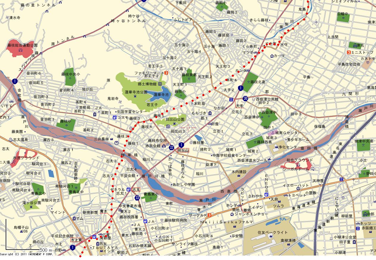 | 府中(静岡)- 藤枝 地図→①静岡~丸子 ②丸子~岡部 ③岡部~鬼島 ③鬼島~藤枝 |