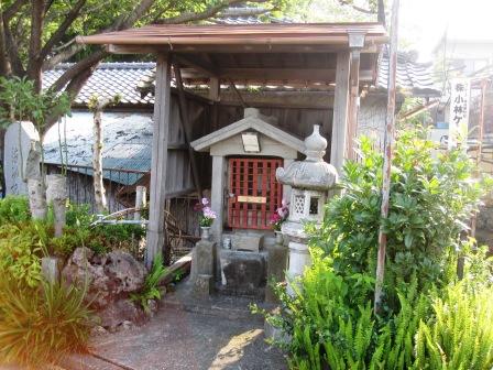 | 蓮生寺から戻り約200mすすんだ右手奥に若一王子神社がある。 由緒によると、天平2年(730)創建という。永保3年(1083)源義家が後3年の役で奥州に向かう途中参拝し、松の枝に藤の花 旧道から入る細道の脇に、文化12年(1815)の秋葉山常夜燈がある。 |