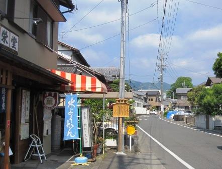 国道1号線の手前右に観音堂がある。 100mほど国道の左の歩道を歩くと、起樹天満宮のサインのある所で、下に降りる。 旧道は国道と平行して静かな山合いの町並みをとおる。 |