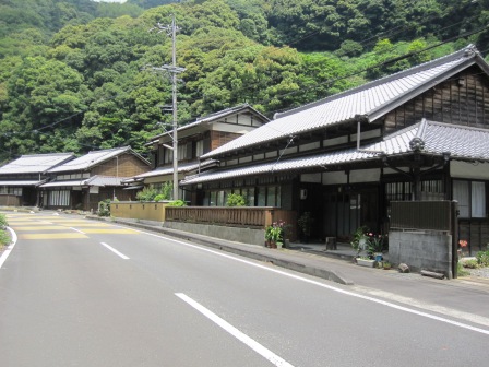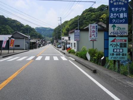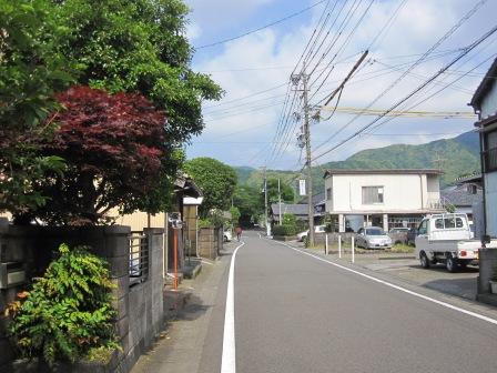 | しばらく進むと、左側に「明治天皇御小休所阯」の石碑があり、ここは、脇本陣があった場所という。その少し先、 神社前の説明板の地図によると、この本陣の東側に問屋場があった。 その先の右側には「、お七里役所」の石碑が立ち、紀州徳川家の飛脚専用の役所跡という(由比宿にもあった)。 道はほぼ真っ直ぐに西の山並みの方に向かう。 |