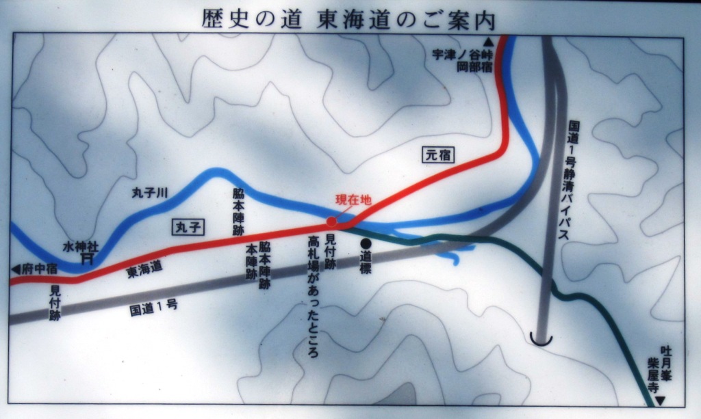 | 橋を渡る手前、丁子屋の向かい側に案内板や石柱が並ぶ。 そのあたりに丸子宿の西の見付跡があり、高札場があった場所という。 旧東海道は、左に分かれ丸子川を渡るが、このまま真っ直ぐ北にいくと戦国時代の山城:丸子城跡や、諸大名や文人が東海道の往来の際に立寄った名所で、連歌師 宗長法師ゆかりの吐月峰紫屋寺(とげつほう さいおくじ)がある、と立て札が示している。 |
