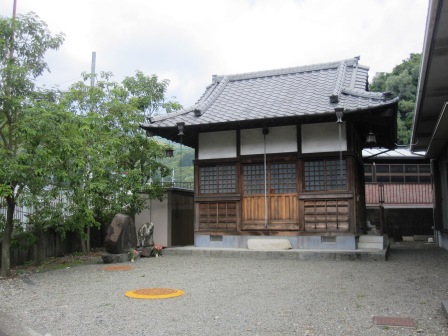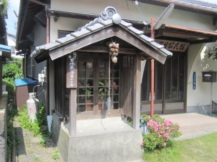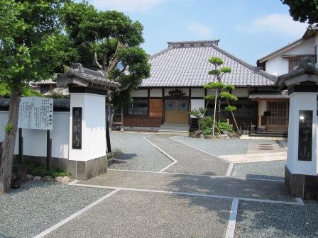 | 元に戻り、右奥に三星寺がある十字路を左折し、岡部川を渡る。 右奥に専称寺がある。 門前の説明板によると、江戸時代後期の作という西行座像と、鎌倉前期の作といわれる不動尊立像が保管されているという。 すぐ先で、県道に合流する。 |