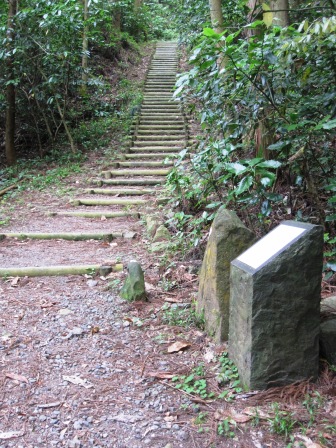 | この先すぐに凹道の峠となる。 下り坂を少し行くと舗装された道となり、その後また山道に入る。 左側に天保6年(1835)建立の「南無法蓮華経」の題目が筆端を髭のように跳ねて書く書体で刻まれている碑が建つ。 静岡県の中部地方では珍しいという。 |