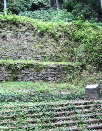 少し先には、その上にある地蔵堂を傾斜地に構えるために積まれた石垣がある。 |