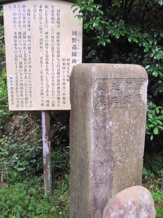 | その先の右側の斜面に階段があり、十石坂観音堂がある。奥に、石塔や石仏が並び、河野蓀園の墓碑がある。 河野蓀園は、駿府町奉行が駿府地誌の編纂を漢学者の山梨稲川(とうせん)に依頼した時に、岡部宿の属する益頭郡を担当した人という。 |