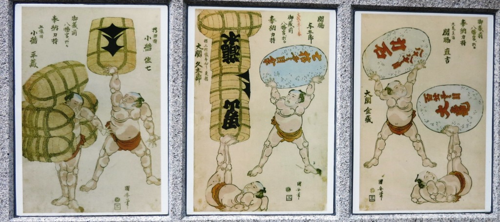 説明板による・・・「5代将軍綱吉が元禄6年(1693)山城国の石清水八幡宮を勧請したのがはじまりで、江戸城鬼門除けの守護神ならびに将軍家祈願所の一社として崇拝されてきた。 また宝暦7年(1757)から天保4年(1833)まで約70年間、境内で勧進大相撲が開催され、回向院、深川八幡とともに三大拠点のひとつであった。なかでも天明2年2月場所では63連勝中の谷風梶之助が小野川喜三郎に敗れ江戸中が大騒ぎになった」 境内には 歌川國安錦絵「蔵前八幡宮二於而 奉納力持」が掲げられている。当時の日本酒の銘柄が入った酒樽が描かれており、宣伝用のポスターではないか、という。 |