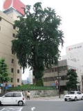 南大通りに戻り、西に向かうと、道路の右側に大きないちょうの木が見える。 大いちょうは、「樹齢400年、樹高33mで、宇都宮城の三の丸と百間掘の境の土塁の上にあり、昭和20年の空襲で焼けたが新芽を吹き見事に再生した宇都宮城ゆかりの名木で、市指定の天然記念物である。」と説明板に記されている。 |