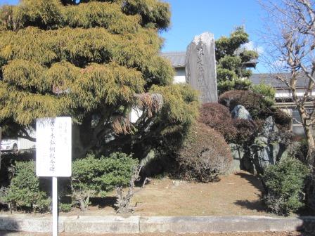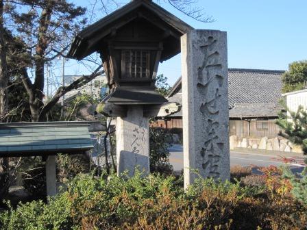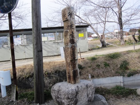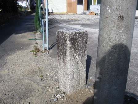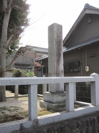天白川を渡った先に、日永神社がある。創建は鎌倉時代の建仁年間(1201~04)と言われるが詳細は不明。 境内には、細い石柱で囲まれた松の切り株と、その前に先のとがった石柱た立っている。説明板によれば、この先の追分の神宮遥拝鳥居の傍に明暦2年(1656)に建立された道標で、正面に「大神宮 いせおいわけ」 右に「京」左に「山田」裏面に「明暦二・・(略)・・南無阿弥陀仏 専心」と刻まれている。 嘉永2年(1849)現在ある道標がたてられた時に近くに移され、その後ここに移された、という。 |