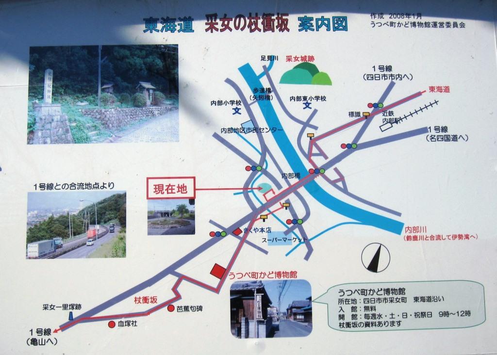 南西に数百m進み、内部川にぶつかる。橋がなく、迂回して並行して走っている国道一号線にかかる内部橋を渡る。右手に小公園があり、「采女の杖衝坂」案内図がある。国道の下をくぐり国道の脇を少しすすむと、消えていた旧東海道につながる。 |