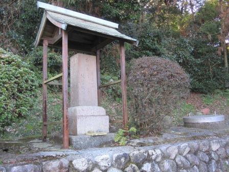 坂の途中の石垣の上に細長い広場があり、「史蹟 杖衝坂」の大きな石柱がある。日本武尊が東征の帰途、疲れていたので剣を杖にしてこの坂を使って上ったのことから、呼ばれたという。 そこには、弘法の井戸といわれる井戸と、芭蕉の句碑がある。 歩行ならば 杖つき坂を 落馬かな 『貞享4年(1687)伊賀に帰る途中、馬に乗ってこの坂にさしかかったが急なため馬の鞍とともに落馬下という、そのときに詠んだ句で、季語のない有名な句で、宝暦6年(1756)村田鵤州が建てた』との石碑もある。 |