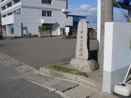 少し先で国道1号線に合 流する。多くの車が行き交うが、途切れるのを待って右側歩道に移る。少し先のガソリンスタンドの脇に「采女一里塚跡」の石碑が建っている。反対側の木立の前に真っ赤な鳥居が見えるので、再び国道を渡る。 鳥居の前の石柱に「豊冨神社」とある。 社殿が東海道と反対側を向いているのが珍しい。 |