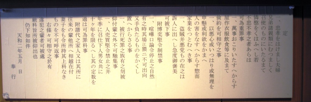 中ほどに江戸期に油問屋だった小林家の住宅が、庄野宿資料館として公開されている。嘉永7年(1854)の建築で、多くの資料が展示されている。中でもほぼ完全な形で残されている、天和2年(1682)の高札は、見ごたえがあるものだった。、 ![]() |