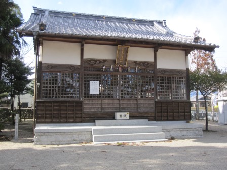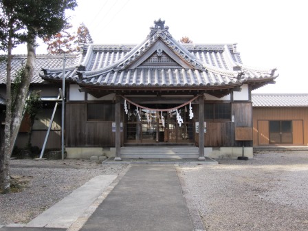 神社の境内にはいっていくと、すぐ右に本殿がありその先に拝殿がある。神社は東海道と反対側の、この場所の南にあたる 鈴鹿川と安楽川の合流地点を向いている。この神社は明治になり、和泉町の「川俣神社」に合祀されたが、のちここに移されたという。 西の端には、「従是西亀山領」の傍示石が建っている。 |