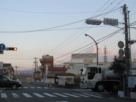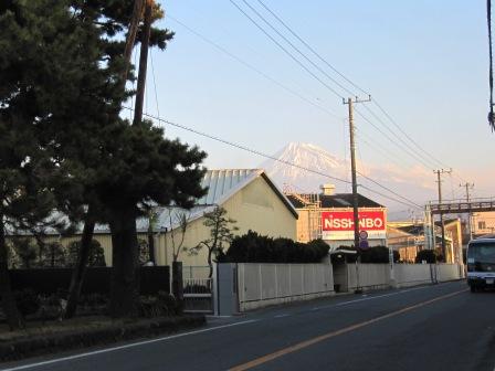 | 吉原に泊まり、昨日と同じ場所で富士山を眺める。6時47分朝日をうけた山頂である。 |