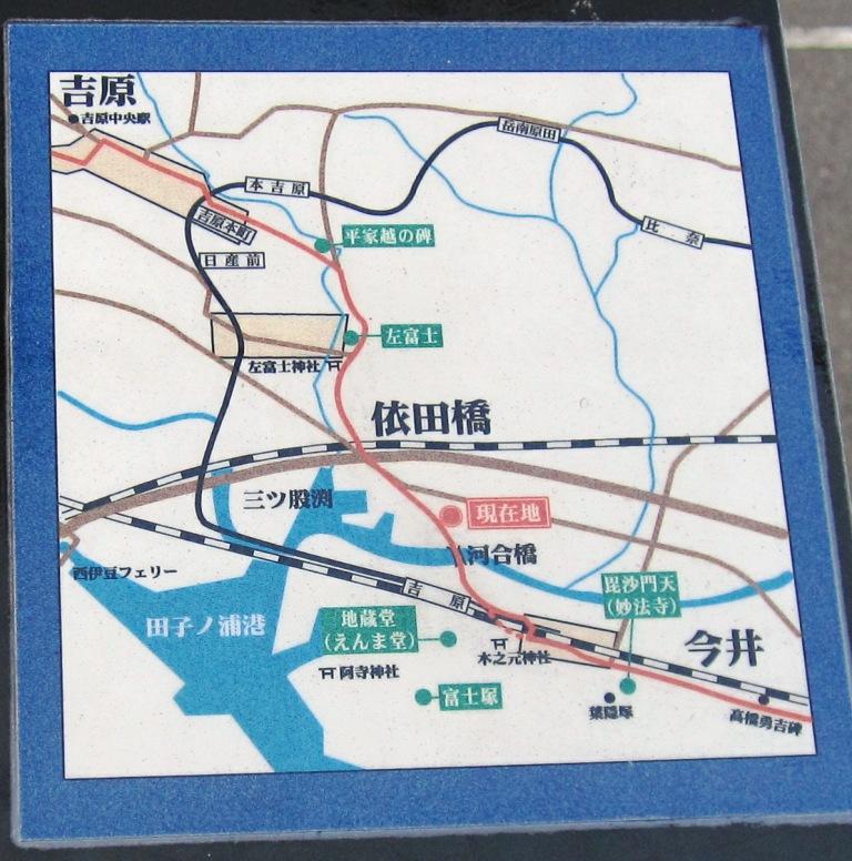 | 道の両側を工場が並ぶ中を進むが国道一号線にぶつかる前に、途中の一本の松が旧道らしい面影を残している。 吉原宿跡の標柱がたち、地図には吉原宿の場所の変遷が出ている。 毘沙門天から木之元神社あたりがもとの吉原宿で、津波・季節風の被害が続くため寛永16〜17年(1639〜40)ごろ、この先の左富士神社手前から西に向かう道のある中吉原宿に移転した。 その後の延宝8年(1680)の大津波で流されたため再度移転し、今の吉原本町駅の西の吉原本町通りが、新吉原宿となった。 |