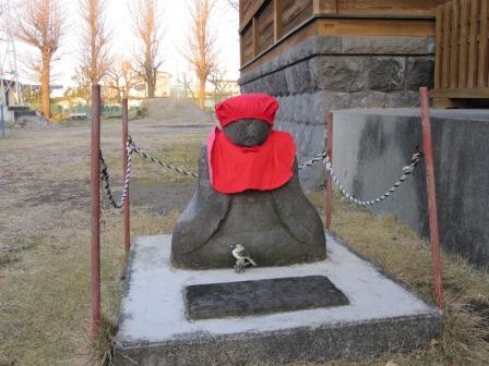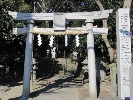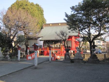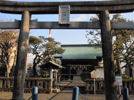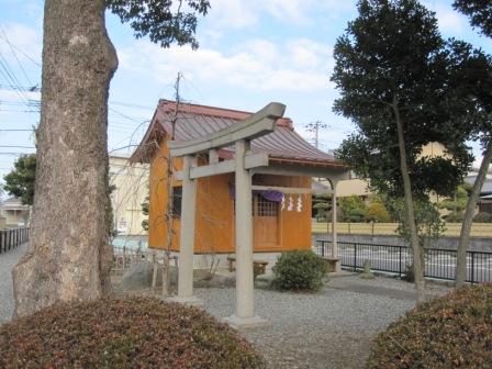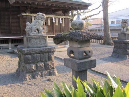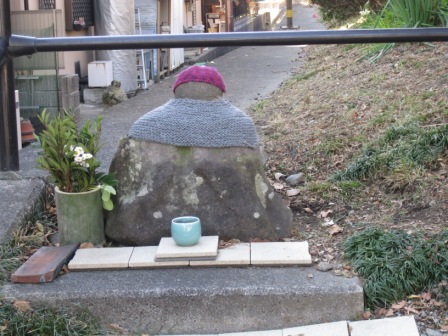 | この先で、中央分離帯のある広い道路にぶつかり、信号のあるところまで迂回することになる。ここを北に向かうと、右側に小さな神社がある。神社の前に置かれている「白石」は江戸時代より熱病を治癒する霊(冷)石とされ、またの名を「疣(いぼ)神様」と呼ばれて親しまれてきたという。祈願の折り、一個を借りてお礼まいり時には2個にして返すという。 | |||