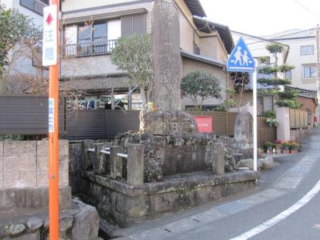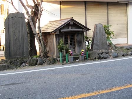 この辺りには、平垣村の高札場があったという。 猿田彦大神などの石塔が建つ |