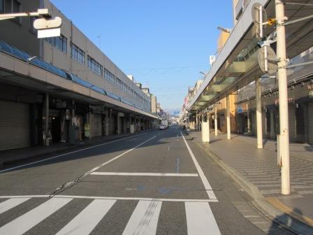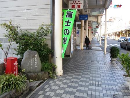 | この先の信号を渡るが、そこは南北に続く長いアーケード通りである。400mほど南に行くとJR富士駅である。 吉原本通りのアーケードと同じく、長く整った通りは壮観である。 すぐ先の信号の角に道祖神がある。 |