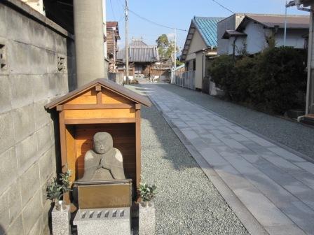 | 信号を渡るとすぐ、法源寺がある。 山門脇に天保14年(1843)の六字名号碑がある。 法源寺前の街道→ |