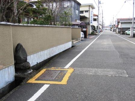 | まもなく小潤井川にかかる小さな橋があるが、その手前右側に富士市の標柱が立ち、西木戸跡があったという所である 青葉通りの北側に道路改修碑があり、その様子を伝えている。 道路改修碑→ |