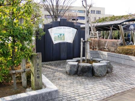 | 富士総合庁舎を過ぎた先に、吉原宿と蒲原宿の間宿の説明板と道標が建つ広場がある。間宿には通常旅籠屋はないが、富士川が渡れない時もあったため何軒かあったという。本市場の名物として、白酒、葱雑炊、肥後ずいき などを扱う |