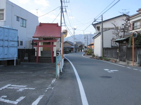 信号を越えた先には、住宅の間に山神社が建つ。 |