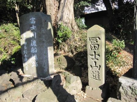 富士川を渡る手前に水神社がある。正保3年(1646)古郡重政が堤防築造の成功を祈願して創建したという。 その境内には、文化元年(1804) 富士川を渡るには、渡船が利用され、その業務は当初は対岸の岩渕村で担当していたが、交通量の増大により、寛永10年(1633)以後、舟役の1/3を東側の岩本村が分担したという。 その右には、宝暦8年(1758)の「富士山道」の道標がある。 |