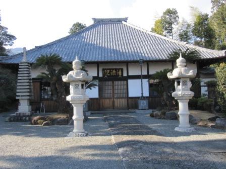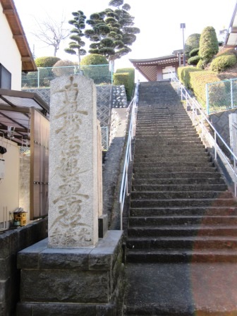そこを右にいくと、光栄寺の境内となる。参道の階段を下に降りると、享保16年(1731)の題目碑があり、側面に「身延山道 小松野江一里半 万澤江三里半・・・」と刻まれた道標となっている。 |