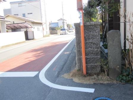 | 防災倉庫前にもきのこ型の常夜燈がある。緩やかな坂を上り、東名高速道路の手 高速道路をくぐると正面に石碑が立ち、東海道は左へ下って行く。 |