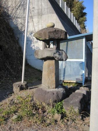 | もとの道標の場所に戻り、南に進む。間宿 岩淵となる。 右側に秋葉山常夜燈がある。岩淵には、こうした自然石を利用したきのこ型の常夜燈が多い。 |
